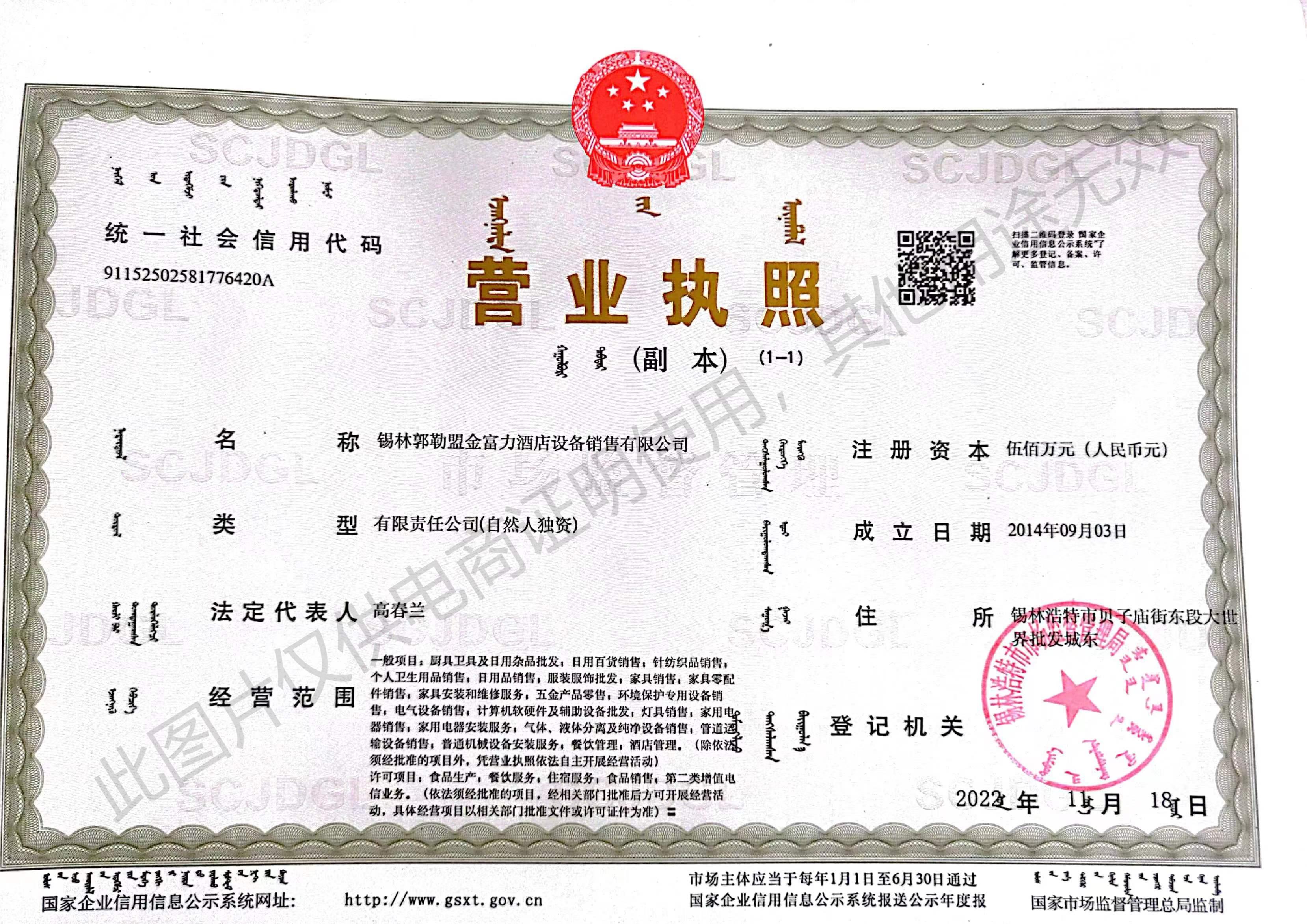 錫林郭勒盟金富力酒店設(shè)備銷(xiāo)售有限公司